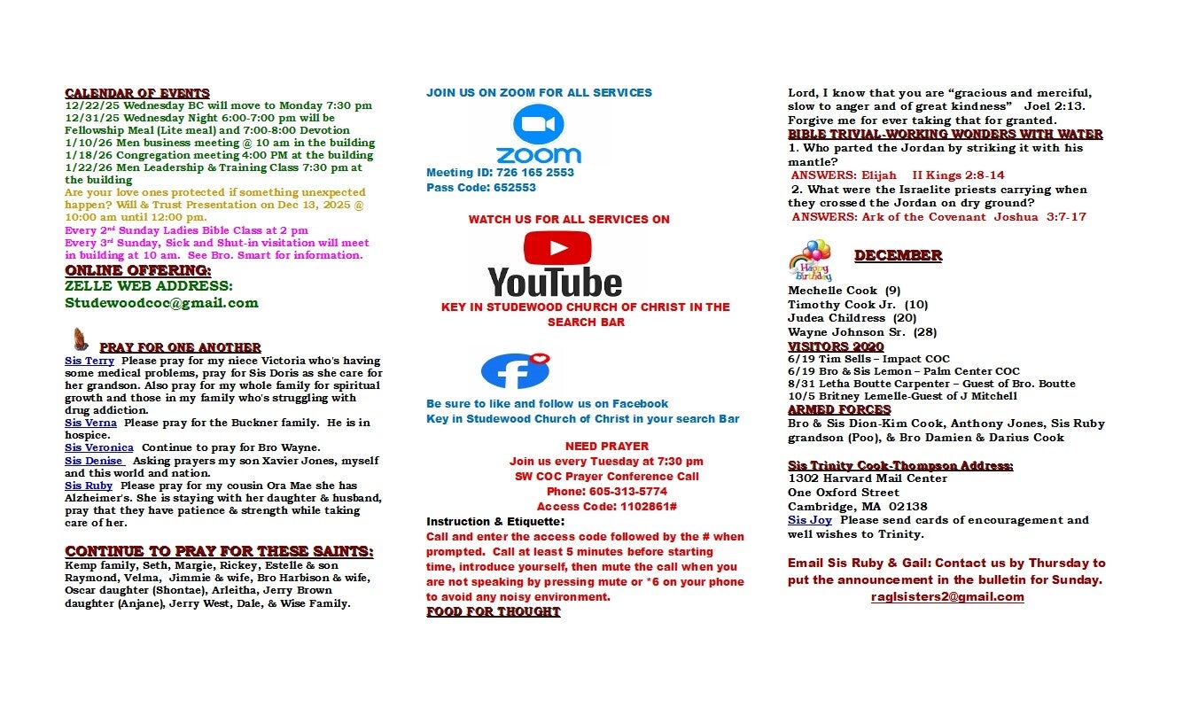 The Church of Christ in Studewood is a place of worship and community for individuals, and families seeking to grow in their faith. We believe in the power of God's love, faithful works, and spiritual growth, and we welcome everyone with open arms.
